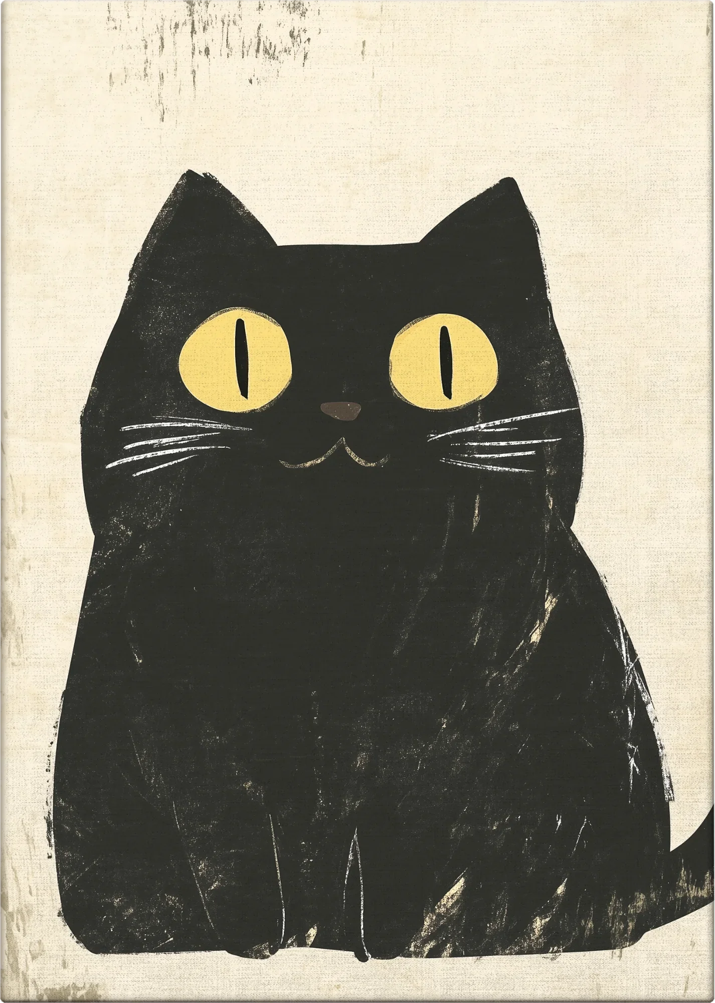 A captivating blend of childlike charm and sophisticated simplicity. This endearing composition features a wide-eyed black cat with striking yellow eyes, rendered in bold brushstrokes that highlight the contrast between the midnight-dark fur and cream background. The minimalist design captures the essence of feline curiosity with just a few essential elements: pointed ears, luminous eyes, delicate whiskers, and a subtle smile.