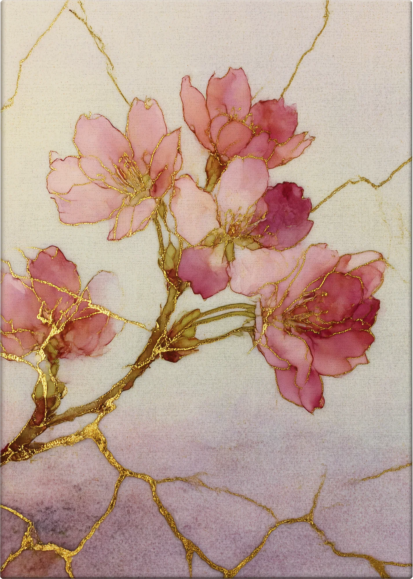 Cherry blossoms bloom in soft pink tones, their golden-lined branches inspired by Kintsugi radiating warmth and grace. Symbolizing fleeting beauty and the arrival of spring, Rebirth captures the essence of new beginnings and the cycles of life. It is a visual celebration of fresh starts and the quiet joy of growth.
