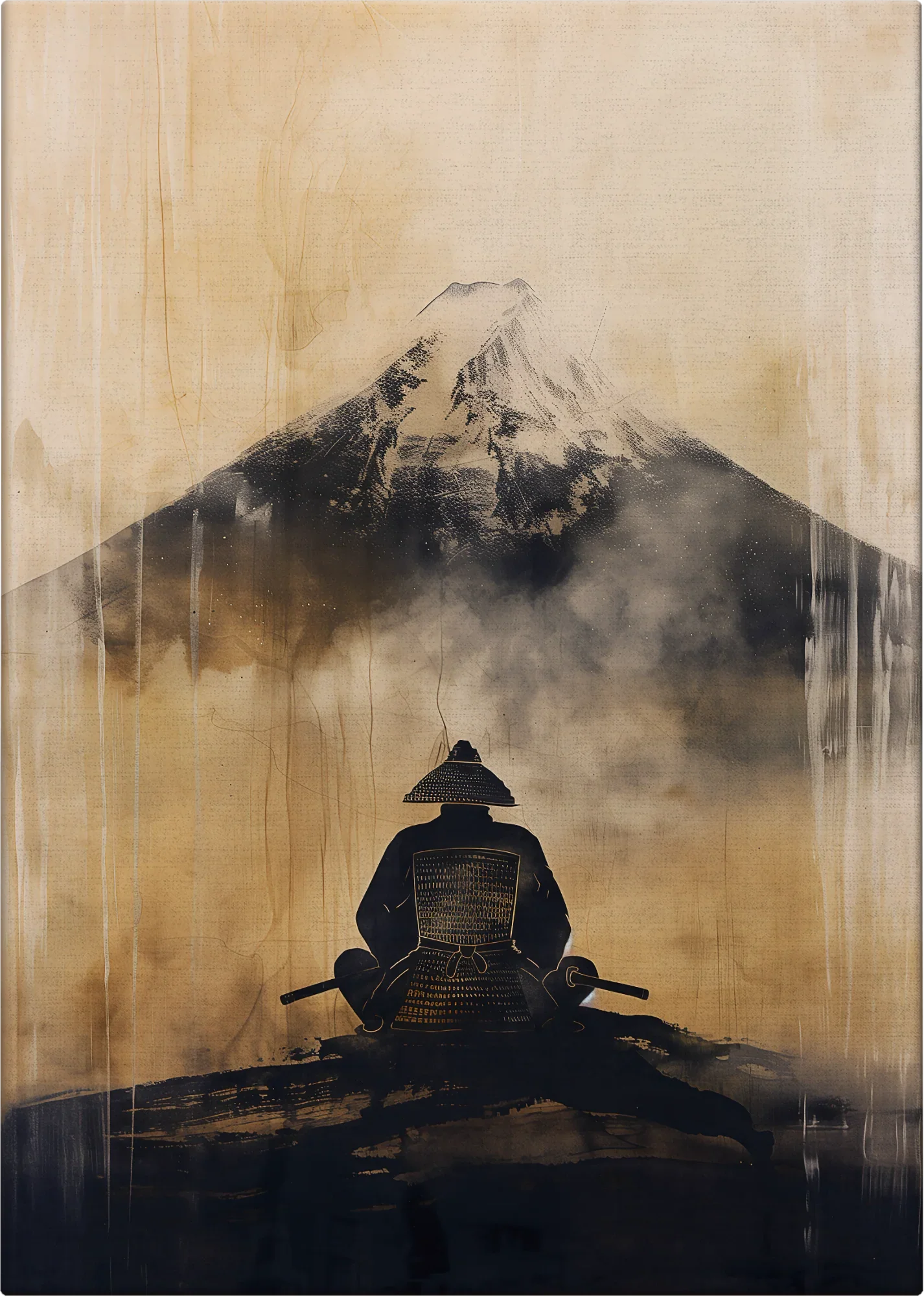 A striking fusion of tradition and modernity, this powerful composition captures a lone samurai gazing upon the towering presence of Mount Fuji, shrouded in mist. The muted, earthy tones and flowing textures create an atmosphere of quiet contemplation, evoking the spirit of ancient warriors and their relentless pursuit of mastery.