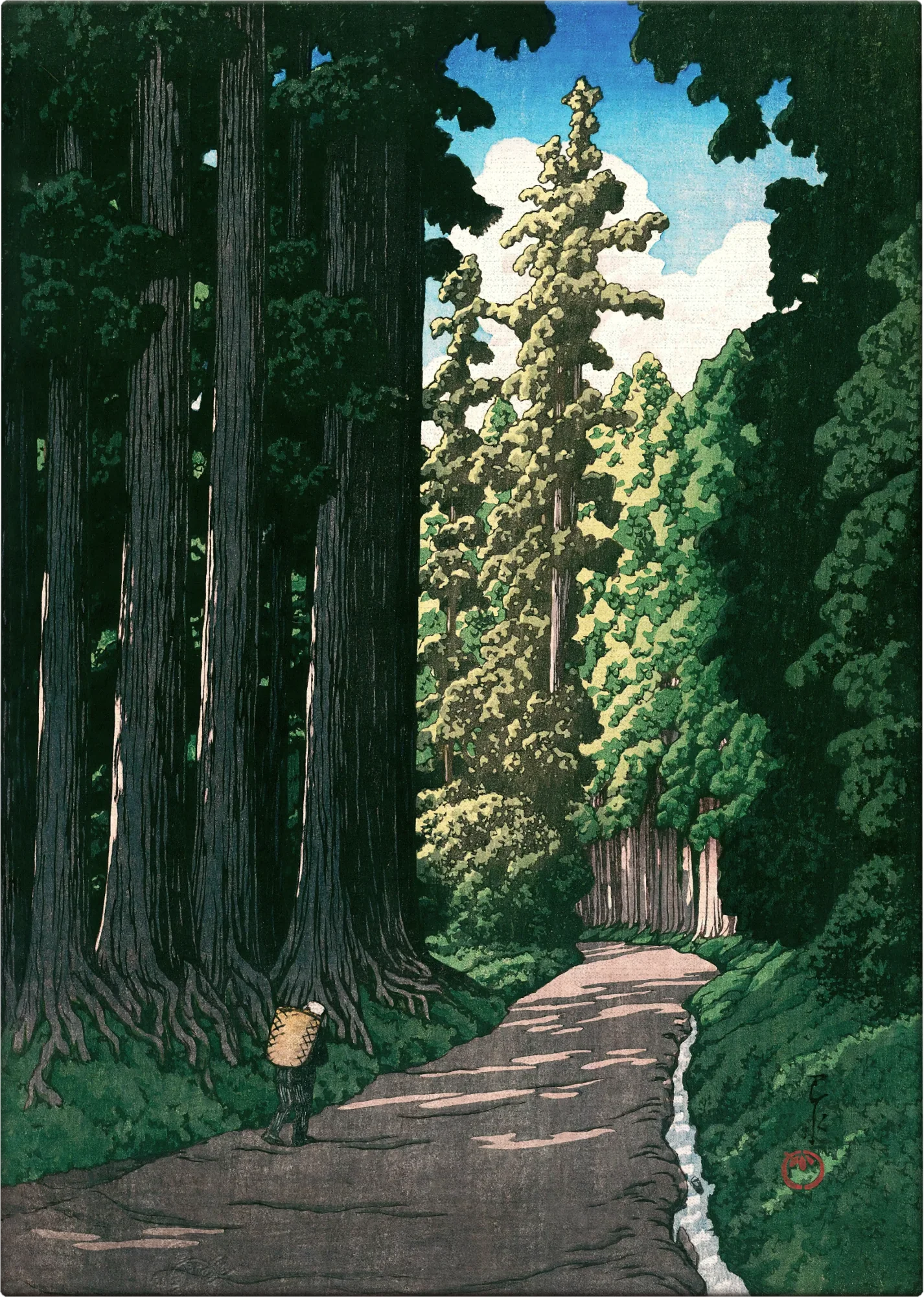 A quiet path, flanked by towering cedars, an invitation to step into a world of reflection and reverence. In The Road to Nikko, Kawase Hasui captures the quiet strength of nature and the stillness of a journey through sacred ground. The crisp light and defined lines create a sense of clarity and focus. A moment suspended in time.