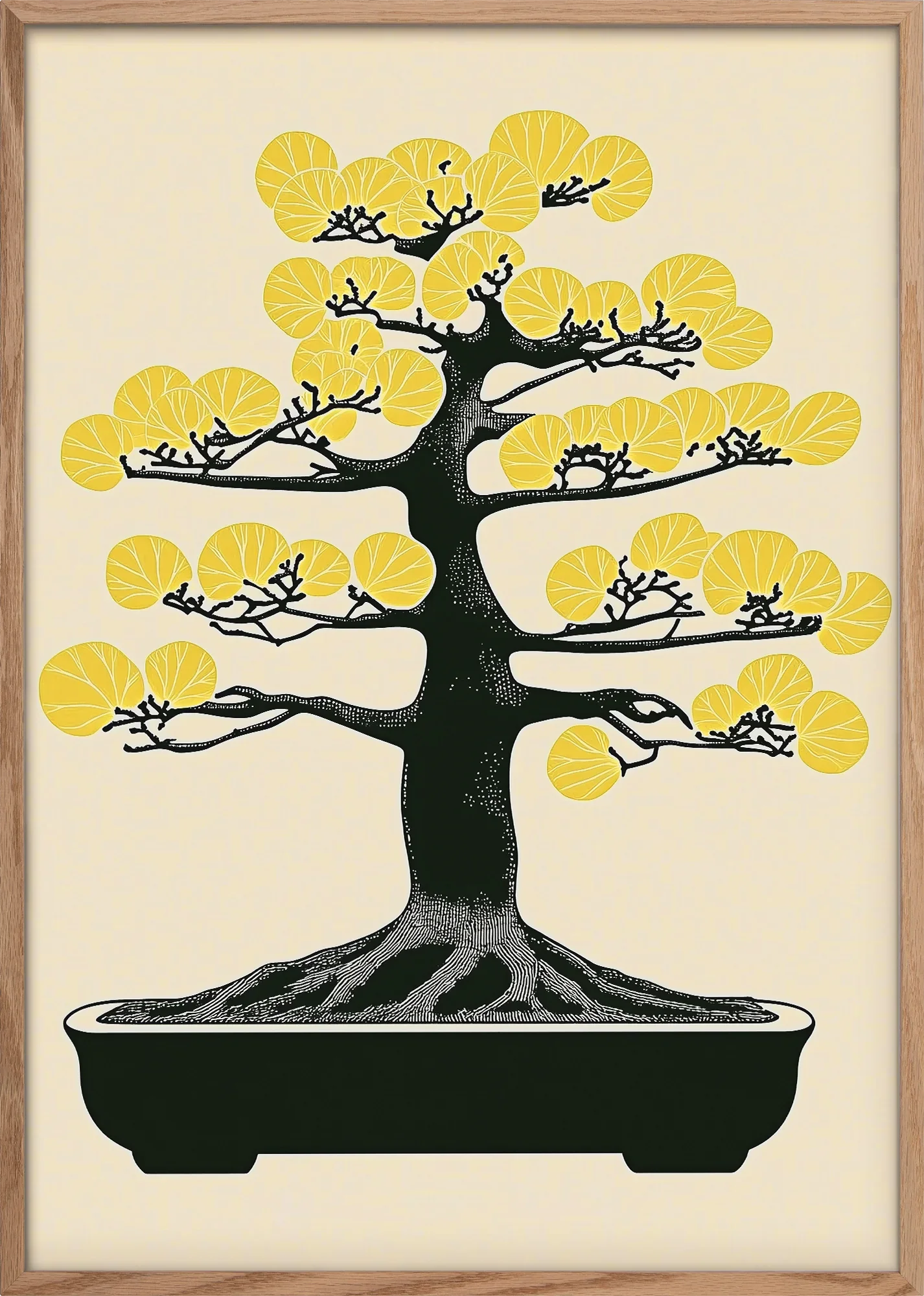 A mesmerizing celebration of the ancient art of bonsai, reimagined with contemporary flair. This striking composition features a meticulously detailed black bonsai tree adorned with luminous golden foliage, creating an exquisite contrast of strength and delicacy. The minimalist design highlights the tree's graceful silhouette against a warm cream background, capturing the essence of Japanese aesthetics while adding a touch of modern luxury.
