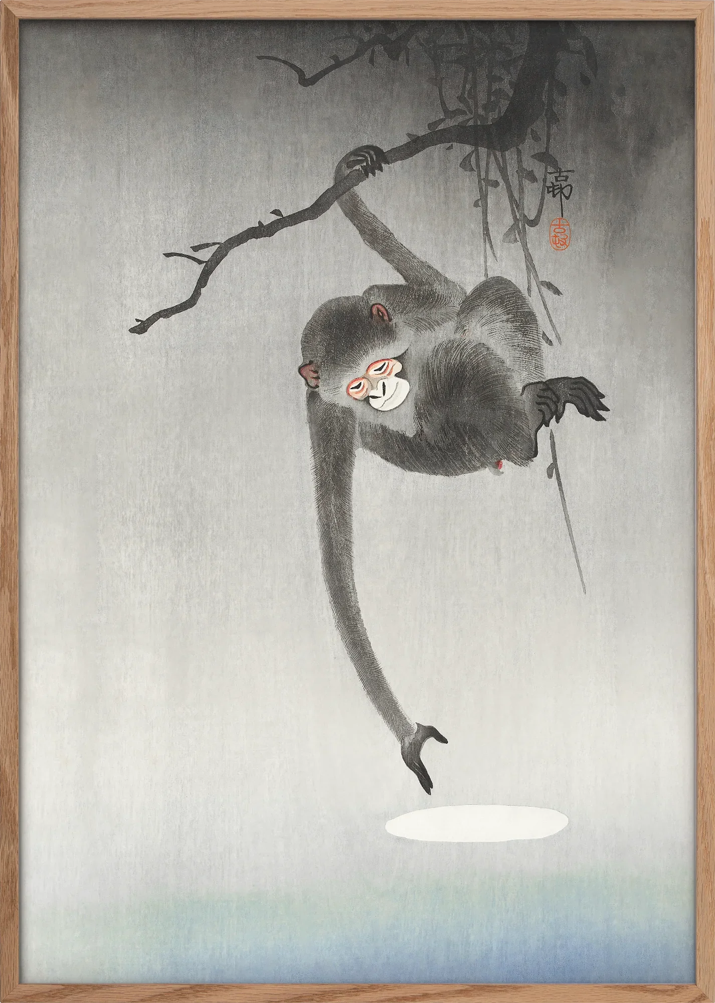 A poetic and symbolic masterpiece from Japan’s celebrated kachō-e artist. This striking composition captures a monkey reaching towards the water, seemingly grasping for the moon’s reflection—a timeless motif representing illusion and unattainable desires. The delicate shading and flowing brushwork create a sense of movement, while the soft misty background enhances the dreamlike atmosphere.