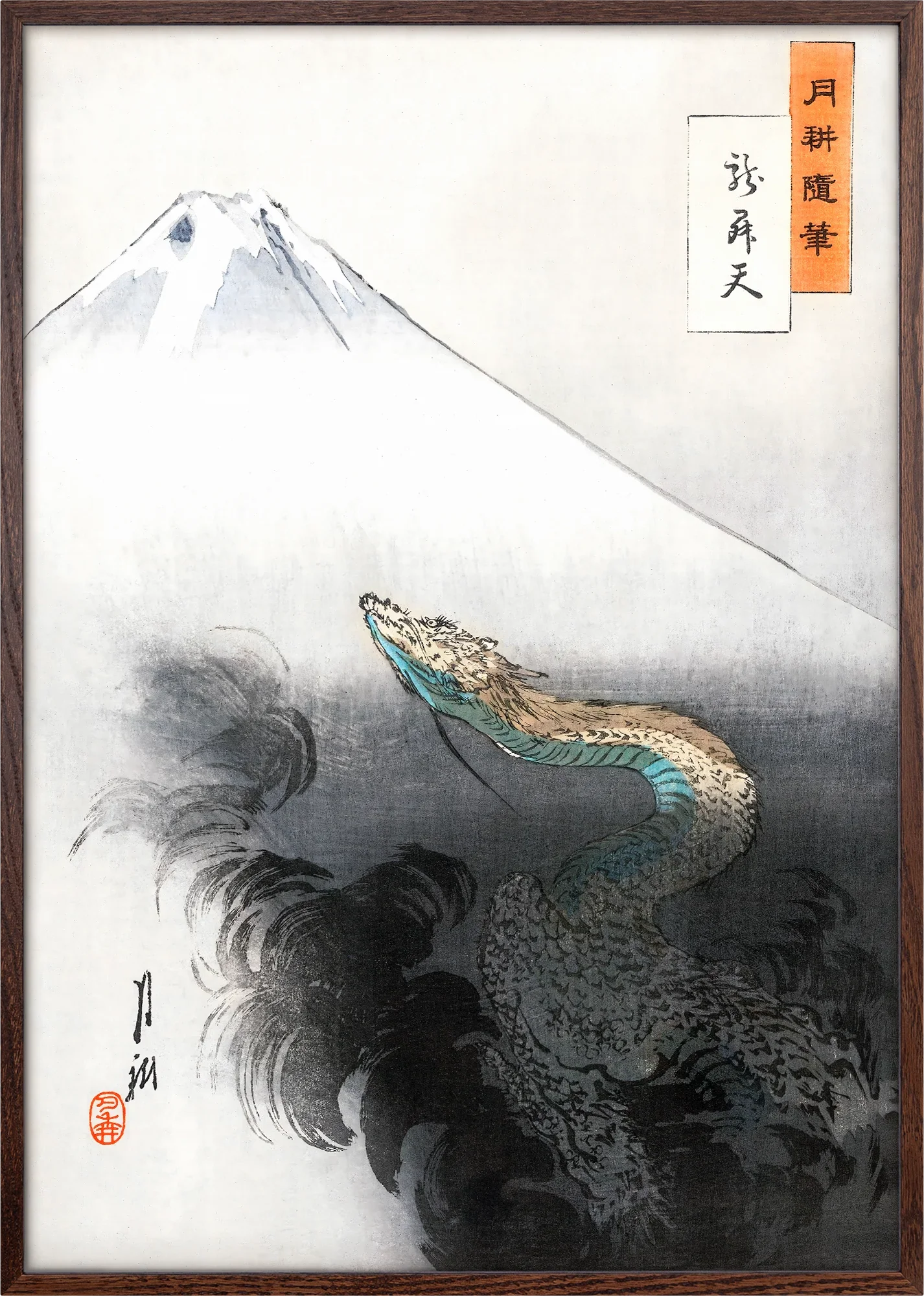 Crafted in the classic ukiyo-e style by Ogata Gekko, the composition masterfully balances dynamic movement and serene stillness, with the dragon's serpentine form contrasting against the eternal, unchanging silhouette of Fuji. This piece bridges ancient symbolism with contemporary aesthetic sensibilities, inviting viewers into a world where natural and supernatural realms converge.