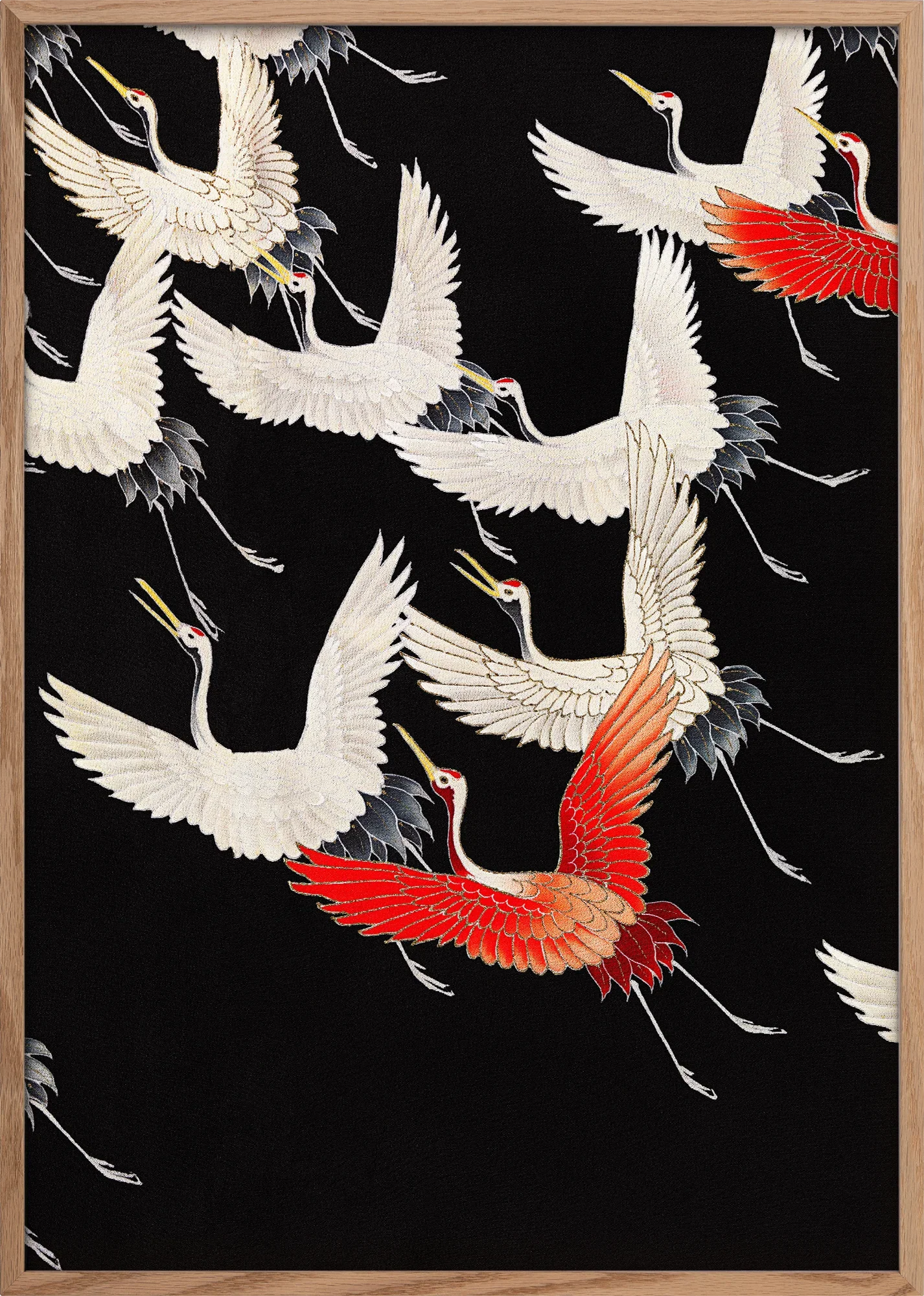In Japanese culture, cranes are enduring symbols of longevity, harmony, and good fortune, often associated with peace and continuity. Shirō’s use of repetition and variation suggests collective motion and quiet optimism, transforming a traditional subject into a visually striking design that remains relevant for contemporary interiors.