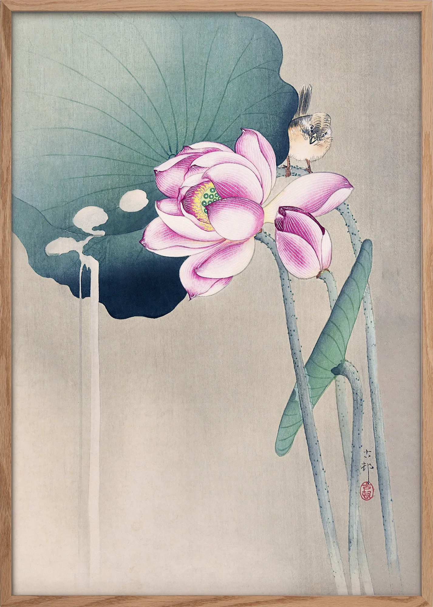 A delicate study from Japan's master of kacho-e (bird and flower prints). This serene composition captures a tender moment between a sparrow and a lotus blossom, rendered in soft pink petals against a misty grey background.