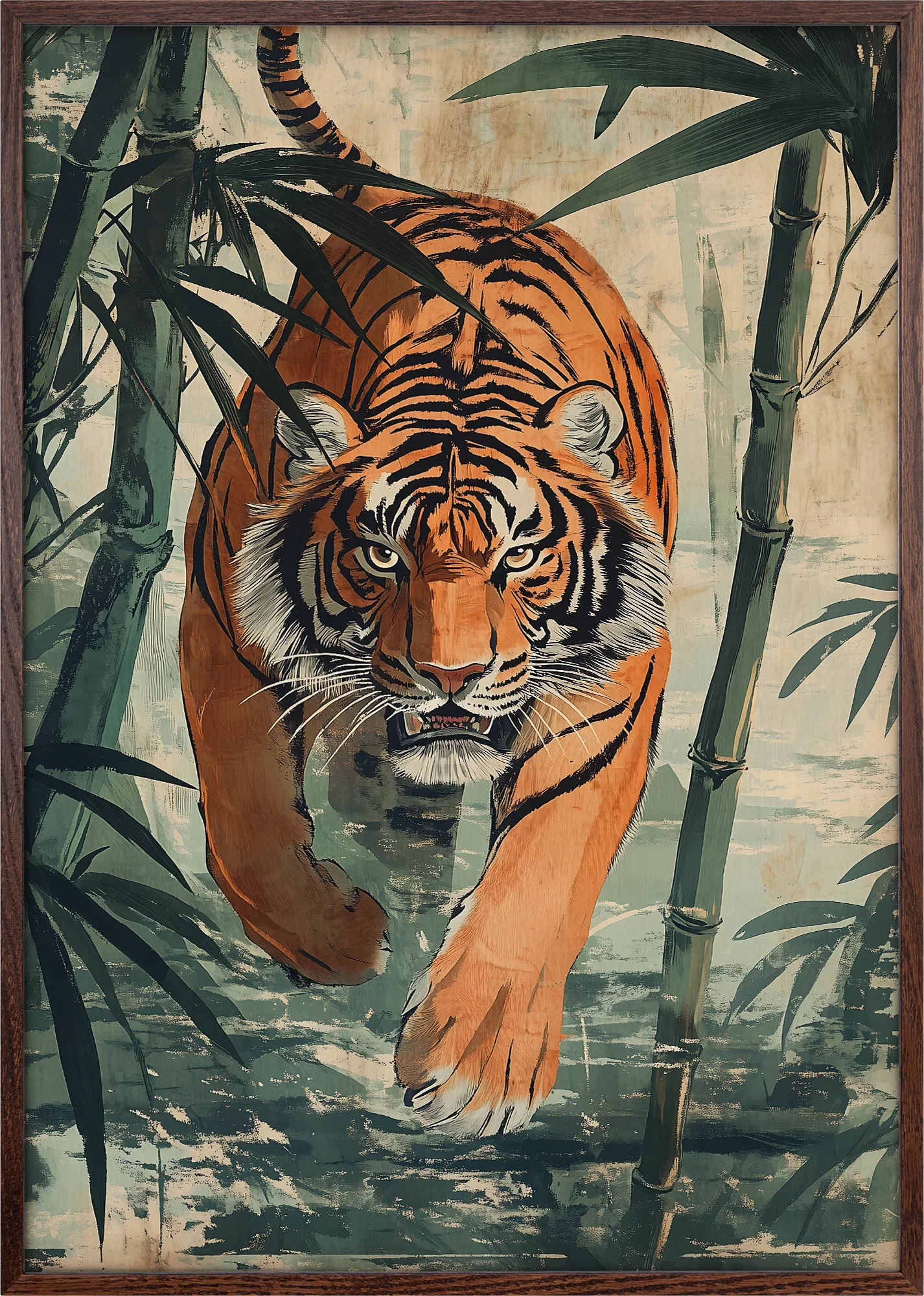 A fierce and mesmerizing vision of strength and grace. This dynamic composition captures a tiger emerging from a dense bamboo forest, its piercing gaze locked in quiet intensity. The rich textures and earthy tones blend traditional Japanese aesthetics with a bold, modern edge, evoking both power and serenity.